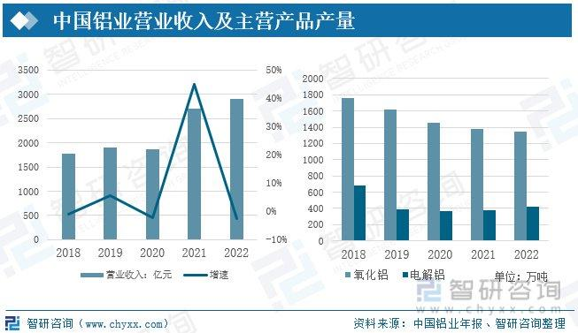 中國鋁業(yè)集團有限公司是中國鋁行業(yè)中唯一集鋁土礦勘探、開采,氧化鋁、原鋁和鋁加工生產(chǎn)、銷售,技術研發(fā)為一體的大型鋁生產(chǎn)經(jīng)營企業(yè),是中國最大的氧化鋁、原鋁和鋁加工材生產(chǎn)商,是全球第二大氧化鋁生產(chǎn)商、第三大原鋁生產(chǎn)商。2021年,受鋁價格上升的影響,中國鋁業(yè)營業(yè)收入實現(xiàn)大幅增長,2021年營業(yè)收入為2988億元,較上年同期同比增加60.65%,2022年中國鋁業(yè)營業(yè)收入為2909億元,較上年減少80億元,同比減少2.64%。受鋁價格上升的影響,近年來中國鋁業(yè)主營產(chǎn)品氧化鋁與電解鋁的產(chǎn)量都呈現(xiàn)出下降的趨勢,2022年氧化鋁的生產(chǎn)產(chǎn)量為1351萬噸,較上年減少30萬噸,電解鋁產(chǎn)量略有增加電解鋁產(chǎn)量為417萬噸,較上年同期同比增加10.03%。