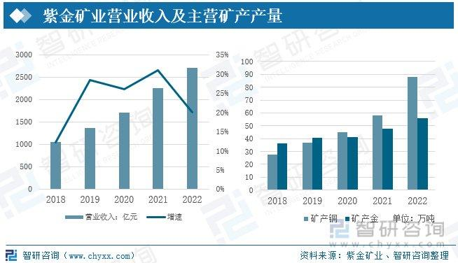 紫金礦業(yè)是一家在全球范圍內(nèi)從事銅、金、鋅、鋰等金屬礦產(chǎn)資源勘查、開發(fā)及工程設計、技術應用研究的大型跨國礦業(yè)集團,是中國控制金屬礦產(chǎn)資源最多的企業(yè)之一。紫金礦業(yè)營業(yè)收入近年來保持高速增長的趨勢,2022年紫金礦業(yè)營業(yè)收入為2703億元,較2021年增加20%。2019年之前,紫金礦業(yè)礦產(chǎn)金的產(chǎn)量大于礦產(chǎn)銅的產(chǎn)量,2020年開始,紫金礦業(yè)開始大力發(fā)展礦產(chǎn)銅,礦產(chǎn)銅的產(chǎn)量實現(xiàn)高速增長,2022年,礦產(chǎn)銅的產(chǎn)量為88萬噸,較2021年增加30萬噸,同比增加51.72%。