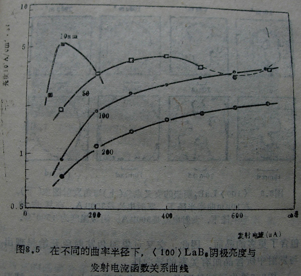 實(shí)驗(yàn)指出,尖端曲率相當(dāng)小時(shí),可以得到低功函數(shù)LaB6所希望有的高亮度。但在長(zhǎng)期工作時(shí)間內(nèi),小曲率半徑的陰極僅僅在經(jīng)過(guò)較短的工作時(shí)間后,尖端的小球面消失。100μm的大曲率半徑在超過(guò)1500小時(shí)后,仍能保持垂直于光軸的(100)面,因而提供了相當(dāng)穩(wěn)定的發(fā)射。