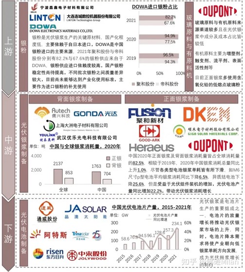 光伏銀漿處于整個(gè)產(chǎn)業(yè)鏈的中游,其上游是銀粉、玻璃氧化物及有機(jī)載體企業(yè),下游是光伏電池片生產(chǎn)商。其中,銀粉是導(dǎo)電相,主要作用是導(dǎo)電,銀粉質(zhì)量的優(yōu)劣直接影響電極材料的體電阻、接觸電阻等;玻璃氧化物是粘結(jié)相,作用是導(dǎo)電膜層介質(zhì)、連接導(dǎo)電相和基底,其自身成分比例和整體在銀漿中的含量過高會(huì)導(dǎo)致銀漿導(dǎo)電性變差,過低無法滲透入鈍化層和硅襯底形成導(dǎo)電接觸;有機(jī)載體是有機(jī)物和部分液體組成,主要作用是導(dǎo)電相和粘結(jié)相運(yùn)載體,控制漿料的流動(dòng)性。光伏銀漿供給主要受中游企業(yè)產(chǎn)量和上游銀粉供應(yīng)的影響,需求受下游硅基光伏電池片產(chǎn)量的影響。