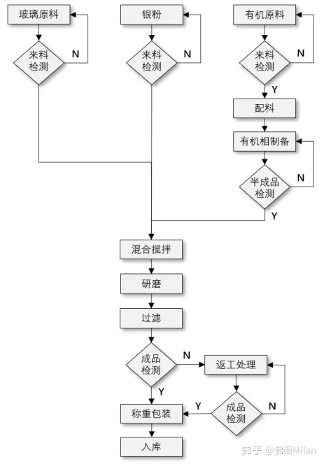 正面銀漿的生產(chǎn)工藝為:將銀粉、玻璃粉(或樹脂)、有機(jī)相等物質(zhì)進(jìn)行配料,隨后放入機(jī)械設(shè)備內(nèi)混合攪拌、研磨,控制攪拌、研磨工藝參數(shù),過濾泄出銀漿,產(chǎn)品性能檢查、包裝、入庫等。