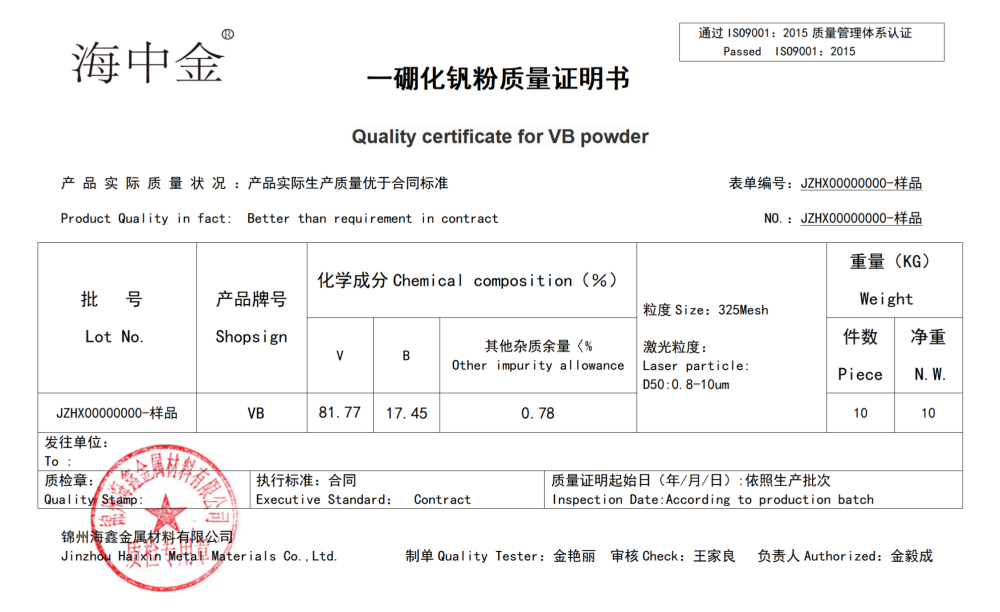 產(chǎn)品性能:VB具有熔點高、硬度大、導(dǎo)電導(dǎo)熱性能好、可抵抗熔融金屬侵蝕等特點。