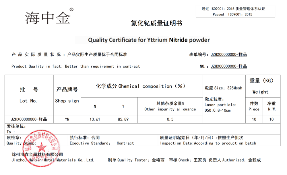 氮化釔的電子導(dǎo)電性能使其在電子器件中具有潛力。 電子陶瓷:用于制造高頻電子元件、絕緣層或介電材料,提升器件的穩(wěn)定性和效率。 半導(dǎo)體輔助材料:作為高純度氮化物的代表,可用于特定半導(dǎo)體工藝中的功能層或保護(hù)層。